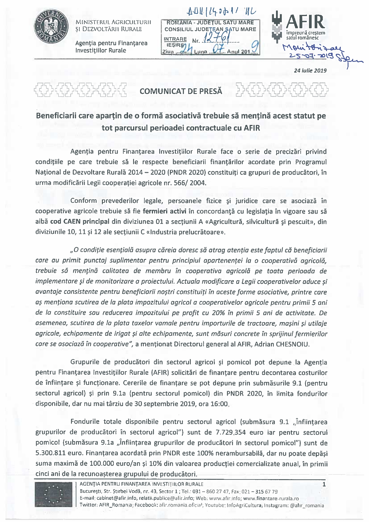 Agenția pentru Finanțarea Investițiilor Rurale anunță lansarea sesiunii de primire a cererilor de finanțare aferente submăsurii 4.2a „Investiții în procesarea/ marketingul produselor din sectorul pomicol” din cadrul Programului Național de Dezvoltare Rurală 2014 – 2020 (PNDR 2020). Sesiunea de depunere a proiectelor se desfășoară în perioada 19 august 2019, ora 9.00 – 31 ianuarie 2020, […]